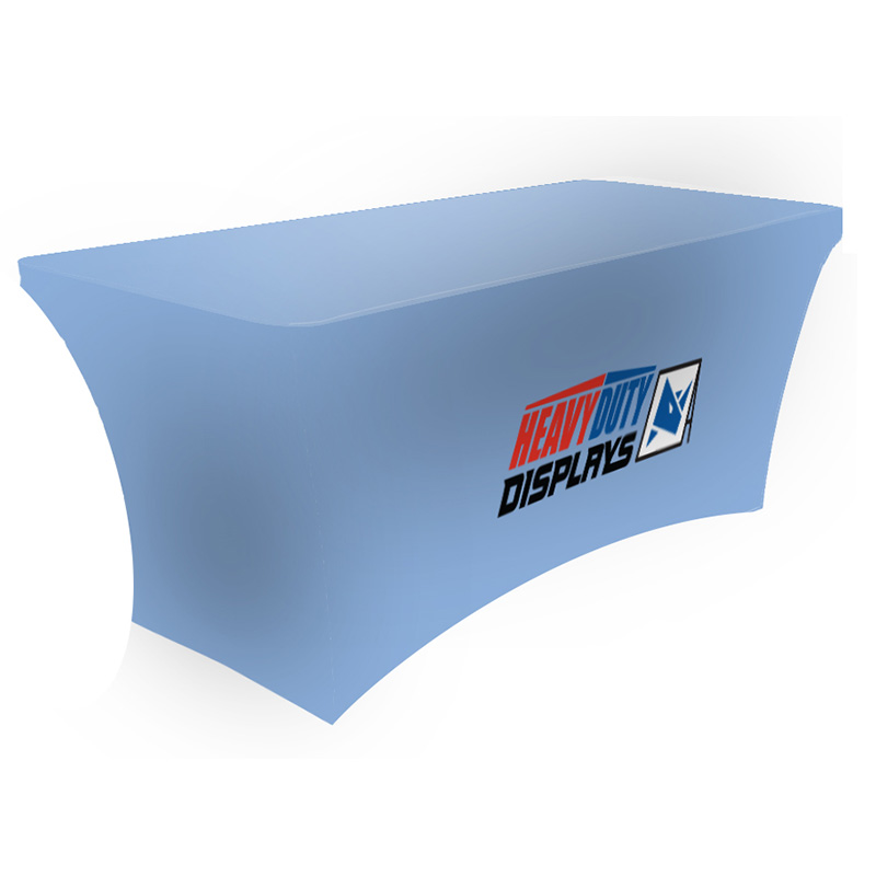 This modern update to the traditional table throw is sleek and eye-catching. The Stretch Table cover fits snug to most 8' collapsible tables, perfect for a variety of tradeshows and events. The table cover is a fully customizable dye-sub graphic print. Canvas loops included securing the cover to each leg during install.