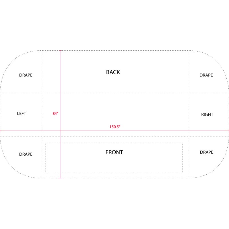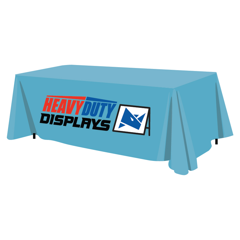 Our standard table cover is a great table topper for trade shows, exhibitions and presentations. Our table covers are dye sublimated and are 100% washable if they ever get dirty. This table cover is made from our 8.8 oz. polyester table fabric and drapes over 4 sides of a 96" x 30" x 30" display table. The table cover is sewn with rounded corners and hang approximately 2" above the floor. This throw drapes over all four sides of the table for complete coverage.Features:Dye sublimationScratch resistantWashableMaterial:8.8 oz. Polyester Table FabricSize and Weight:Template (Upload) Size: 151.51" x 85.01"Finished Size: 150” x 83.5”Weight: 7.3 lbs