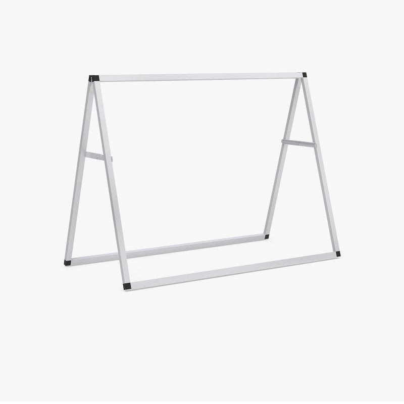Ideal for outdoor events, the A-Frame Banner Display is a durable and effective advertising tool. Can be displayed with a single front graphic or graphics front and back for double the impact. The sturdy aluminum bars easily connect for quick assembly and the grommeted banners are attached via hooked bungee cords.