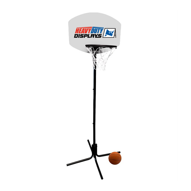 Introducing our premium custom-branded basketball hoop – the perfect addition to your home or office for a mini-basketball experience like never before! This game stands 79″ tall and the backboard is 24in W x 16.5in H. While the base, pole, and hoop remain standard, the highlight of this set lies in the customizable backboard, allowing you to showcase your brand or personal style.Customizable Backboard: Make a statement with a fully customizable backboard that can feature your logo, artwork, or any design of your choice. This is an excellent opportunity to enhance brand visibility or add a personal touch to your mini-basketball setup.Durable Construction: The base, pole, hoop, and net are crafted with durability in mind, ensuring long-lasting performance and stability during every game.Mini Basketball: Included in the set is a mini basketball, perfectly sized for exciting and challenging gameplay. Get ready to shoot hoops and enjoy the thrill of mini-basketball right at home or in your office.Versatility: Suitable for both promotional events and personal use, this custom-branded basketball hoop adds a unique touch to any space. Whether you’re looking to engage clients with a branded sports activity or simply enjoy some recreational fun, this hoop is designed to meet your needs.Easy Setup: With a standard base, pole, and hoop design, setting up your mini basketball court is a breeze. Enjoy the convenience of a quick and hassle-free installation process.Transform your space into a personalized mini-basketball arena with our custom-branded basketball hoop. Showcase your brand, add flair to your surroundings, and experience the joy of mini-basketball with this high-quality and versatile set.