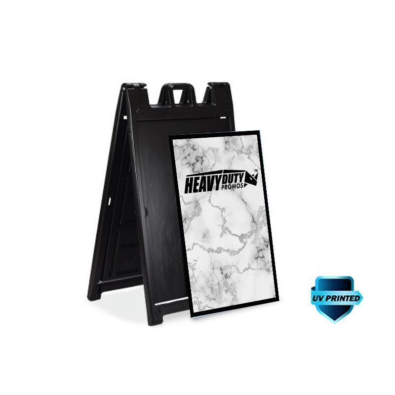 The Signicade Deluxe is the ultimate sidewalk advertising solution for those that need quick change graphics. The heavy-duty plastic sandwich board has two recessed 24x36 inch recessed graphic areas on the front and back. 24" x 36" signs slide easily into place for display, swap out rigid inserts as often as you need. Our graphics are full-color UV direct printed coroplast for a long-lasting durable matte print.