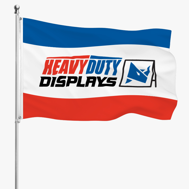 Our custom pole flags can transform your logo or artwork into a dynamic flying reality. Heavy Duty Display flags are direct printed to our lightweight open weave flag material, this allows for ink penetration and creates "Print thru" graphics. Single sided print thru flag graphics are vivid full color on the front but still visible and often legible from the back.. Features:Maximum size 62" x 100'4 oz. Polyester flag materialDirect print dye sublimationWashableOptional Pole and Bracket:The Flag Pole and Bracket Kit is perfect for those wishing to display their Custom Pole Flag. Buy the pole or the bracket separately, or as a set.The bracket has two positions for displaying the pole.The tangle free pole has a top section that spins on ball bearings, this will increase the life of your flag and keep the flag from getting twisted on the pole. Also included are clips to secure the flag into place and a plastic ring for use with grommets. Recommended for 2x3 or 3x5 flags.2 Piece - 74.5 Aluminum Pole with Chrome BallPowder coated white flag bracket