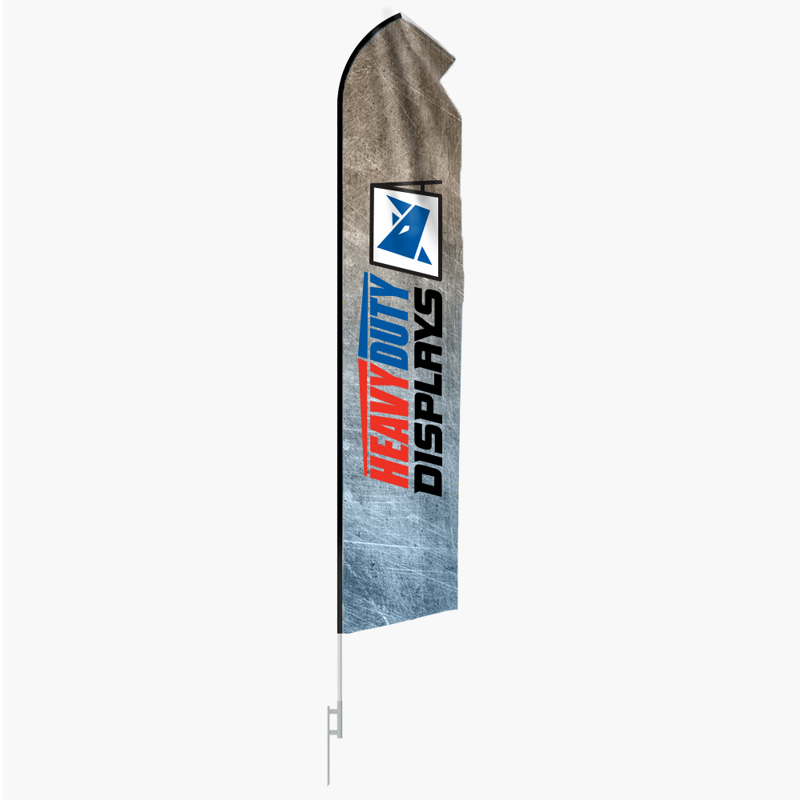 Designed for outdoor installations, the Econo Feather Flag stands 16 feet tall. The top of the graphic has a free edge that flutters with the wind and creates eye-catching movement. This large flag comes with a brushed aluminum pole set and ground stake for use in planters and soft ground. The dye sublimated flags are printed direct to the material creating a "print thru" graphic which can be seen on the front and back.