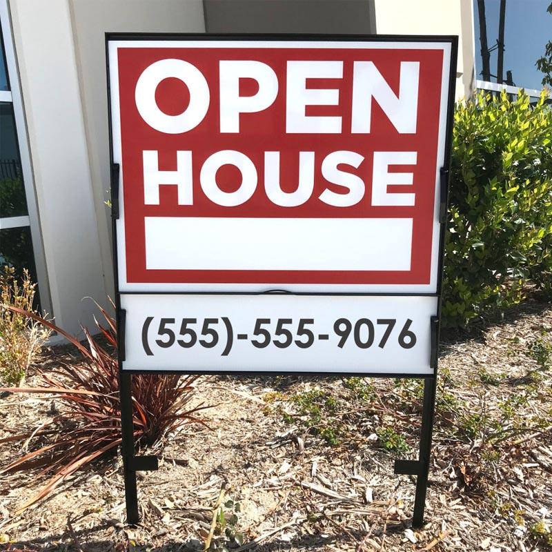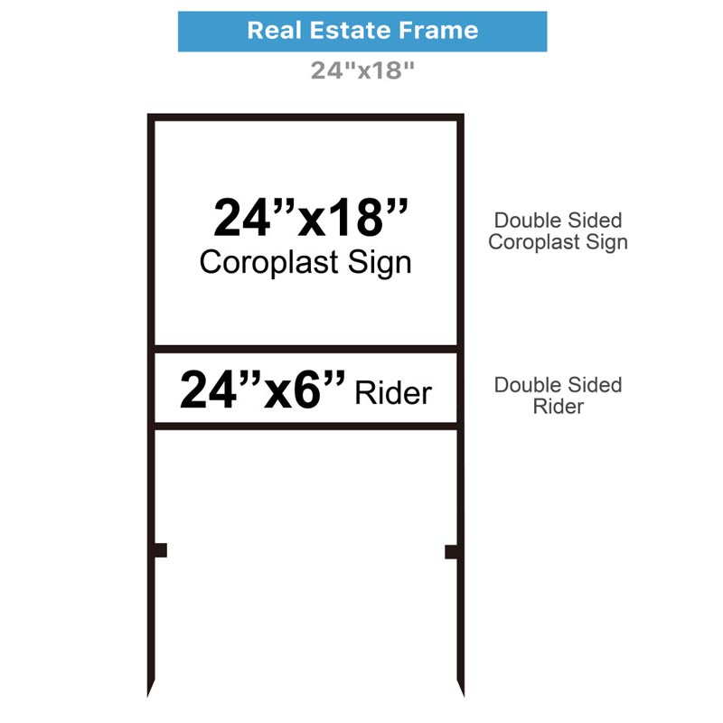 The Real Estate Frame is perfect for advertising installation in soft ground; such as lawns, medians, fields. The sturdy and durable black powder coated frame is constructed of steel for maximum strength and longevity. The pointed legs make installation a cinch as they can be driven into turf with ease. The double-sided coroplast graphics drop into the frame and are held into place with clips. The frame holds 1 double-sided 18 x 24" sign and an additional 6" x 24" rider.