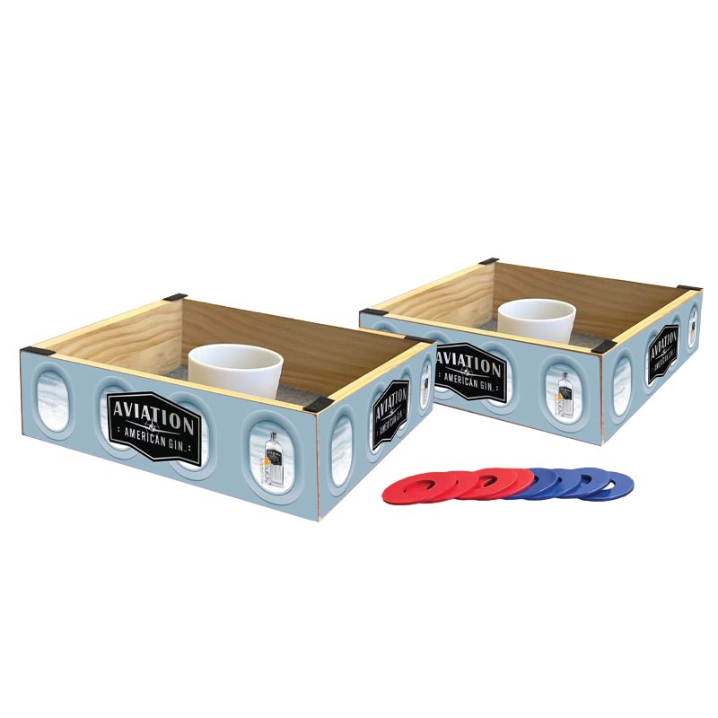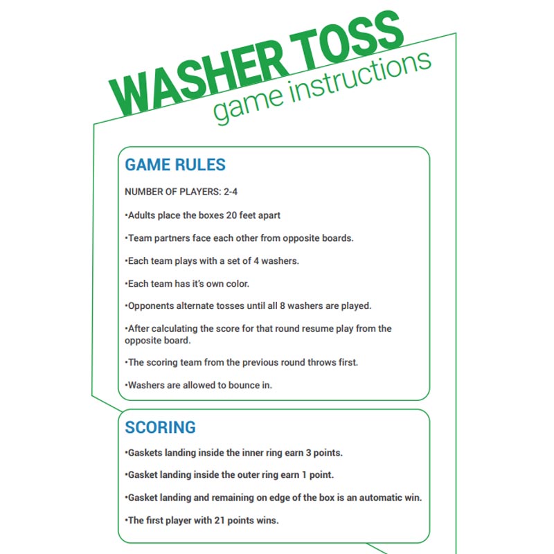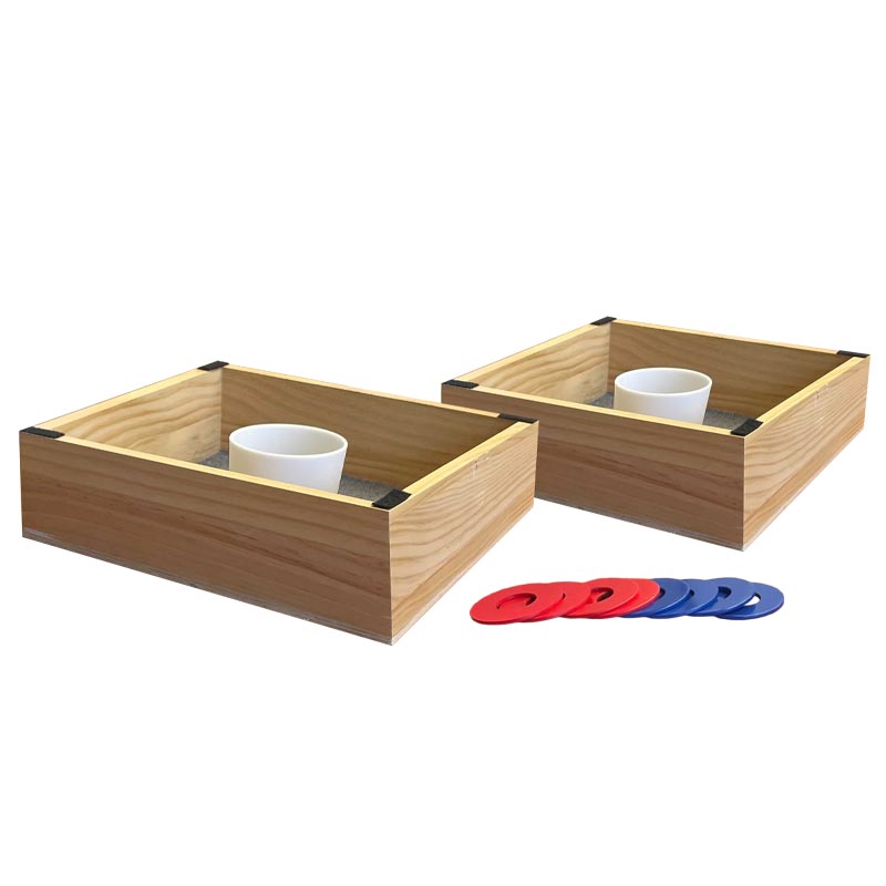 Washer Toss, a thrilling outdoor game, combines the fun of horseshoes with the precision of tossing washers. Known by various names such as washer pitching, washer toss, or even huachas, this game brings excitement to tailgates, barbecues, and backyard gatherings. The goal is to toss metal washers, typically around two inches in diameter and 1/8 inch thick, toward a target—a hole or box that may feature a PVC pipe or can. The standard setup places two wooden boxes approximately 20 feet apart. Players take turns tossing the washers underhand, aiming for either the hole (earning 3 points) or the box (earning 1 point). The game uses a system similar to horseshoes where the second team has the opportunity to rebut any points scored by the first team, adding a layer of strategy to the fun. With each team competing to reach 21 points, Washer Toss offers endless entertainment for all ages. Whether it’s a friendly neighborhood rivalry or a spirited tournament, this game always delivers a thrilling challenge.Each Washer Toss set includes two wooden boards, sized 14″ x 14″ x 4″, and 8 metal washers—4 red and 4 blue. The game is made from all-wood construction and features high-quality vinyl imprinting on three sides of the box. This setup is perfect for custom branding and personalization, allowing you to showcase your logo and message in full color. The natural wood color provides an elegant backdrop that complements the vibrant washers. A white carry handle is included on one side of the box for easy transport, making it convenient to bring the game to your next outdoor event.The official Washer Toss box dimensions are carefully designed for optimal play, ensuring that the hole is the perfect size for a challenging yet achievable toss. With its compact size, the game is easy to store and transport, while still offering the same fun and excitement as larger setups. Whether you’re playing in your backyard or at a tailgating event, the Washer Toss game is sure to be a crowd-pleaser. With an included full-color imprinting option, your promotional message or branding will be the center of attention as players compete in this fast-paced, skill-based game.