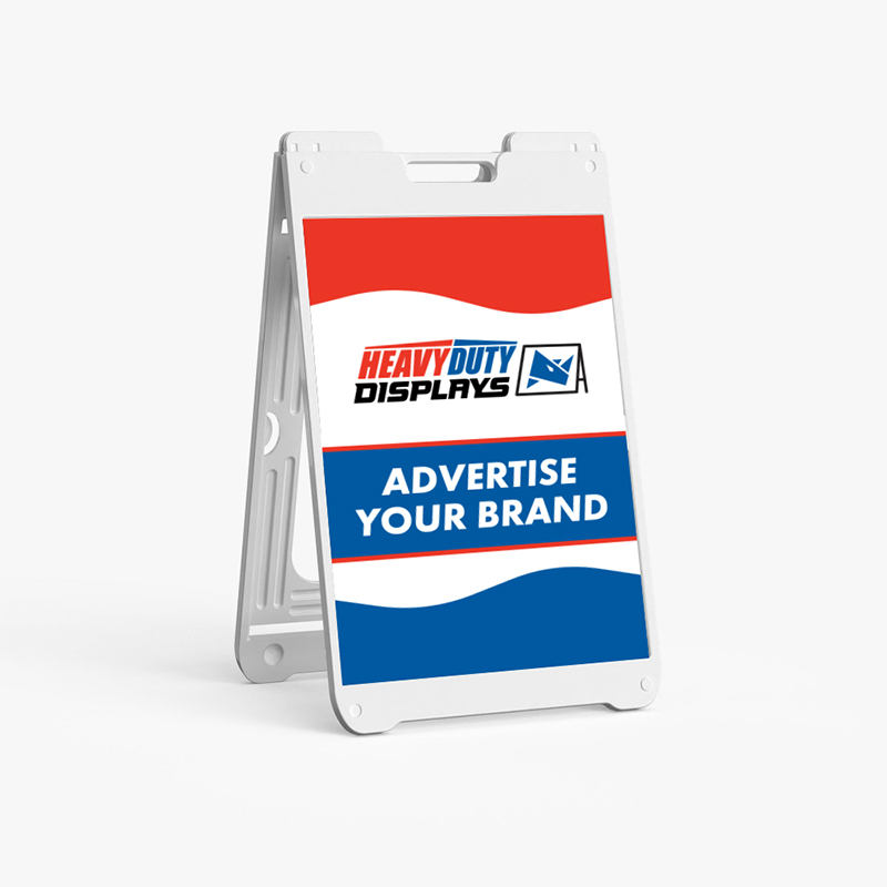 The SimpoSign® II is a lightweight counterpart to the Signicade and Signicade deluxe. The minimal hardware is designed for ultimate portability. The SimpoSign II includes a stabilizing bar and a hollow core where sand or water can be added to increase weight. This A-frame is built for quick change graphics, the molded plastic sandwich board has two recessed 22x28 inch graphic areas on the front and back. Our graphics are full-color UV Direct Printed Coroplast for a long-lasting durable matte print.Graphic Material :1 or 2 Single-Sided 4 mm White Coroplast InsertsProduct Details :Product Dimensions: 37”H x 24”W x 2”DGraphic Dimensions: 22"W x 28"HWeight: 10 lbs